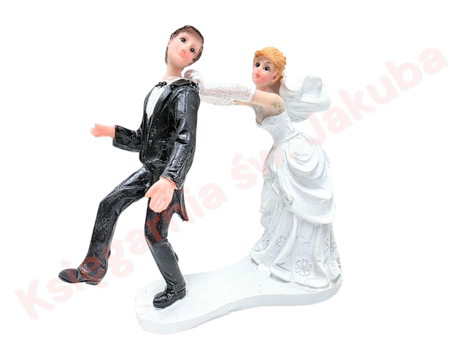 Zabawna figurka młodej pary w śmiesznej pozycji, w dwóch wersjach. Pani Młoda rządzi Panem Młodym. Pięknie przyozdobi tort, ciasto, prezent lub miejsca gdzie siedzi Młoda Para. Figurka wykonana jest z żywicy syntetycznej (polyresin) przez co jest dużo trwalsza i mocniejsza od gipsowych.