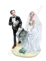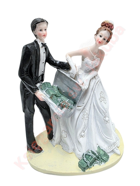 Zabawna figurka młodej pary z walizką pieniędzy w dwóch wersjach. Pięknie przyozdobi tort, ciasto, prezent lub miejsca gdzie siedzi Młoda Para. Figurka wykonana jest z żywicy syntetycznej (polyresin) przez co jest dużo trwalsza i mocniejsza od gipsowych.